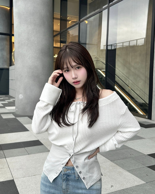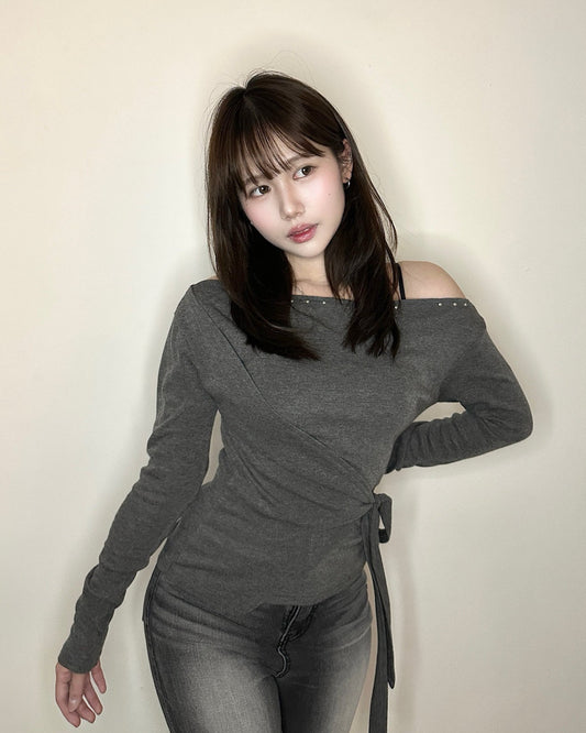 【近期最愛 ♡ 韓系芭蕾舞風】Love At First Sight 鈕釘單邊鏤空交疊綁結一字肩Top