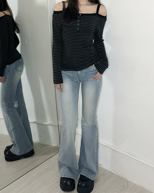 【打造蜜桃臀🍑♪ 日常百搭必入】Pastel Blue 挺身淺色水洗刷白喇叭褲