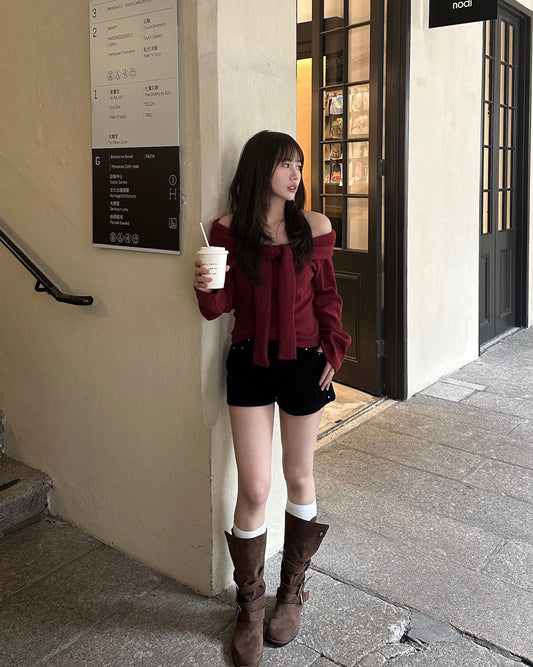 【情人節約會必選💗女友感滿分】Melting Heart 芭蕾舞風絲帶蝴蝶結滑滑絨毛一字肩Top