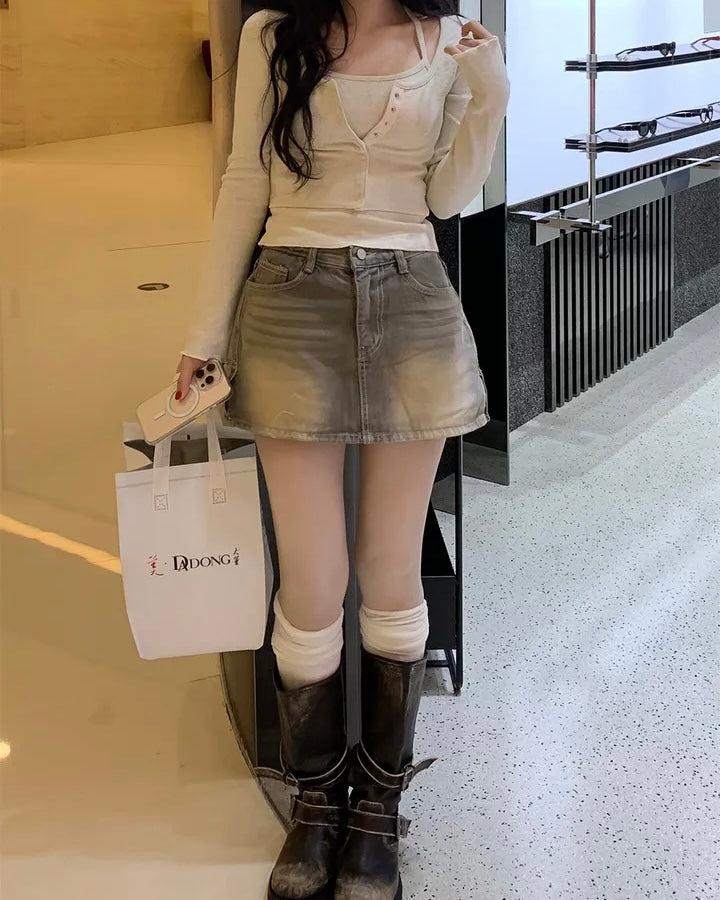 【復古灰調感】Dirty Work造舊高腰水洗開叉牛仔裙褲