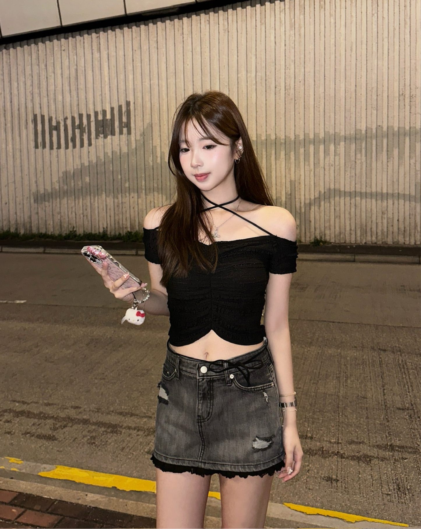 【約會必勝單品】Midnight Bloom皺皺捲邊 3 ways 綁帶一字肩短版Top