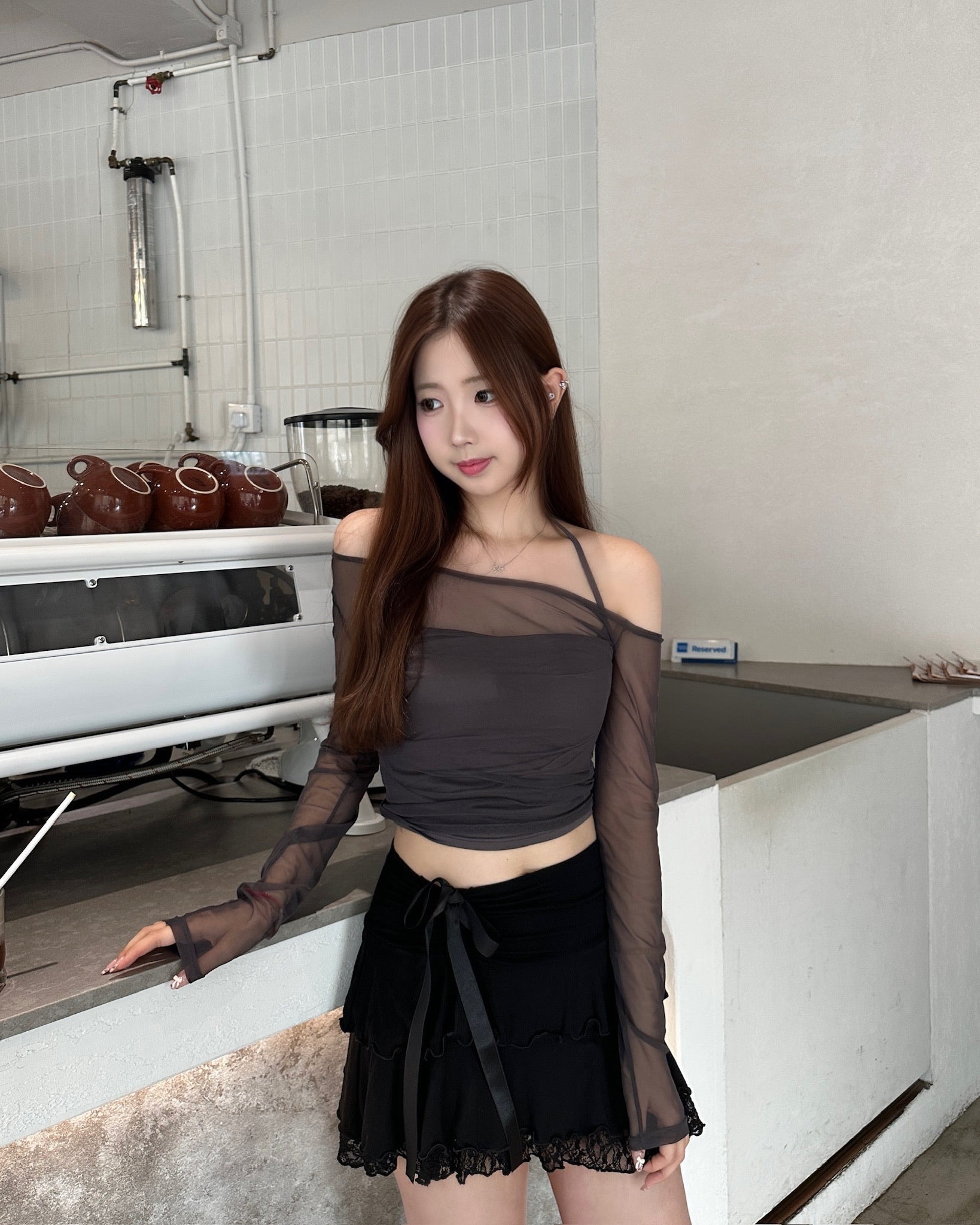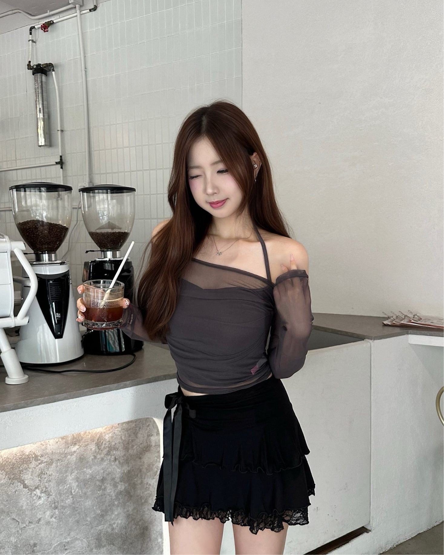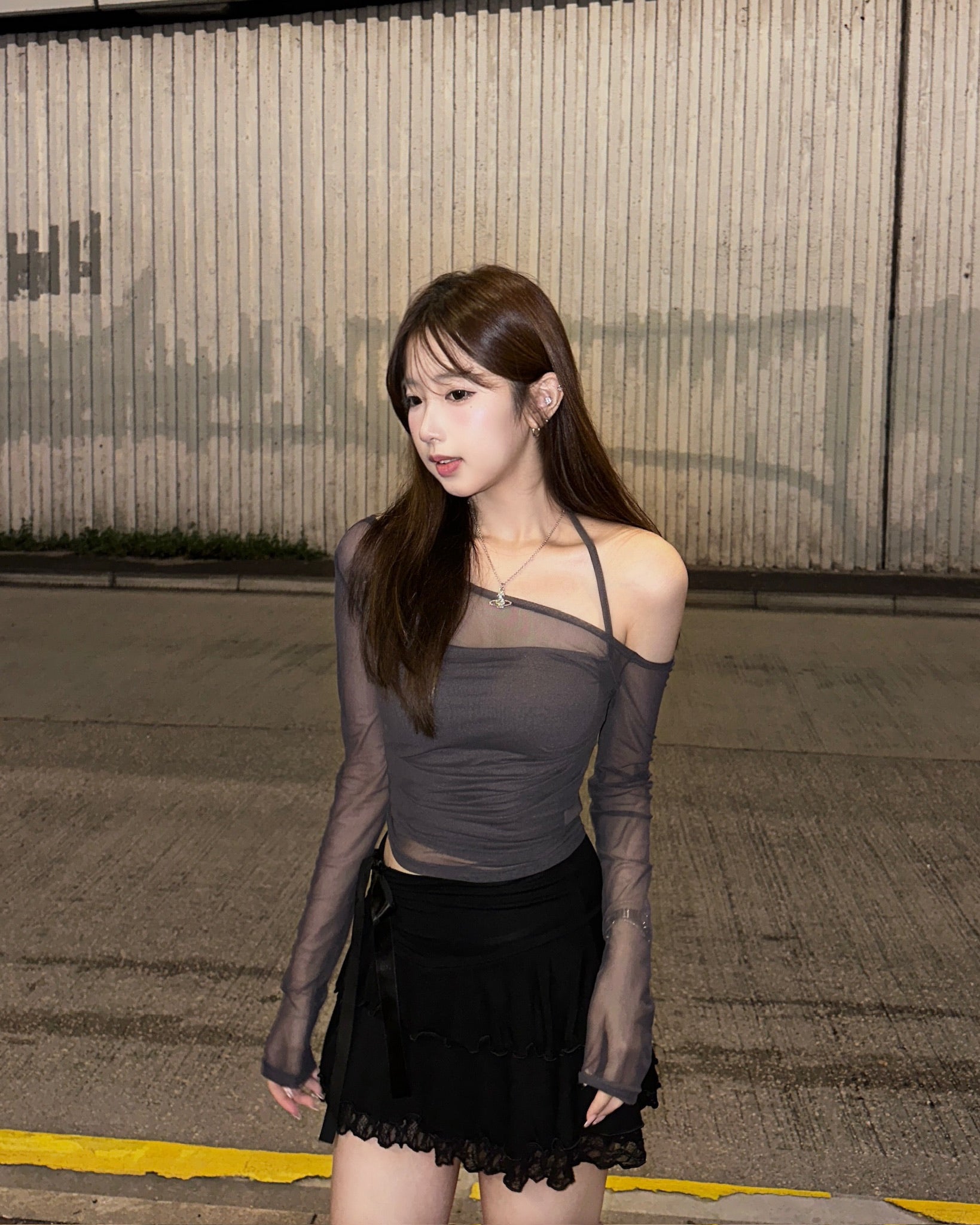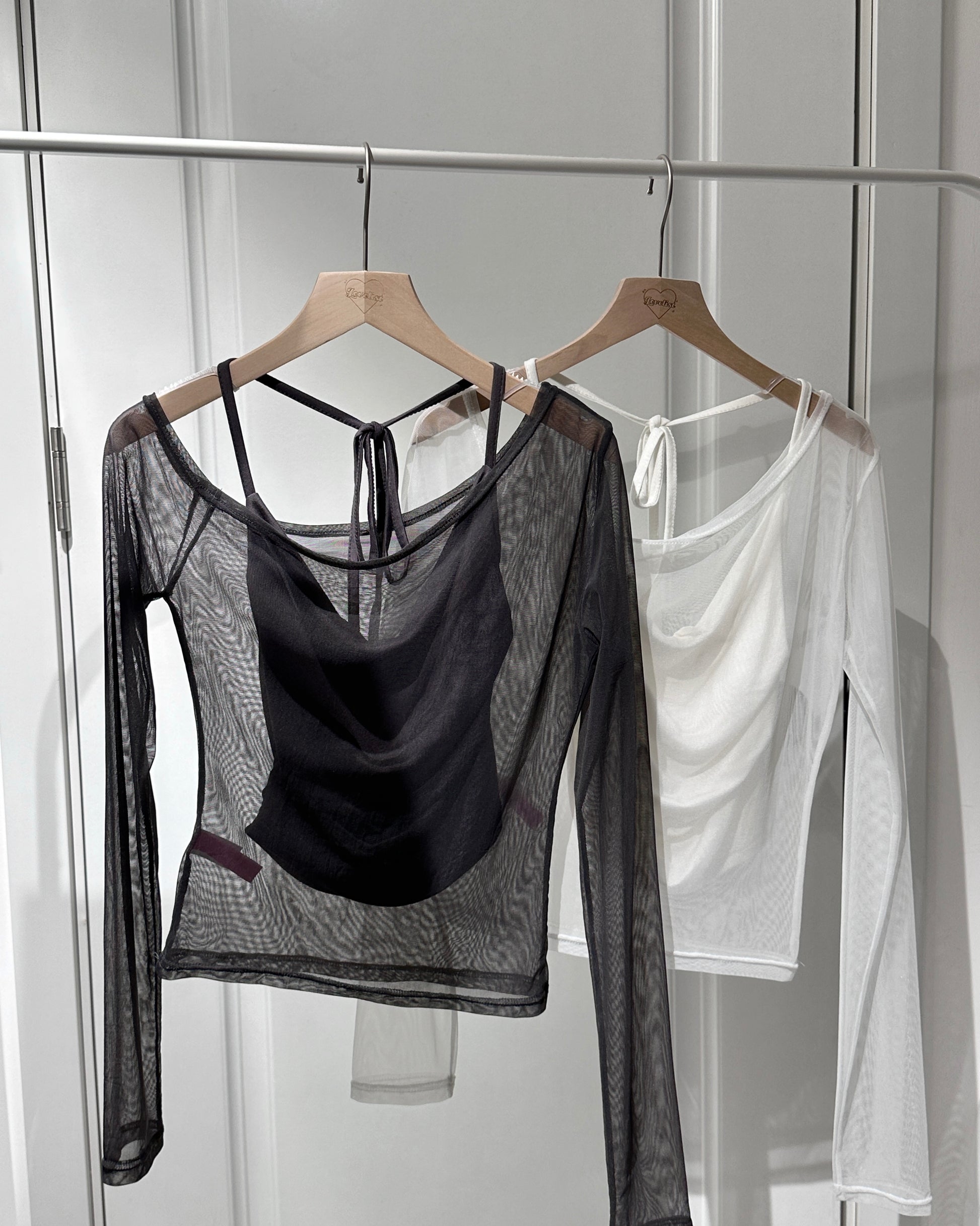 【約會穿搭推薦】Moonlit 斜肩薄紗長袖Top x 絲滑感皺皺掛脖背心 set