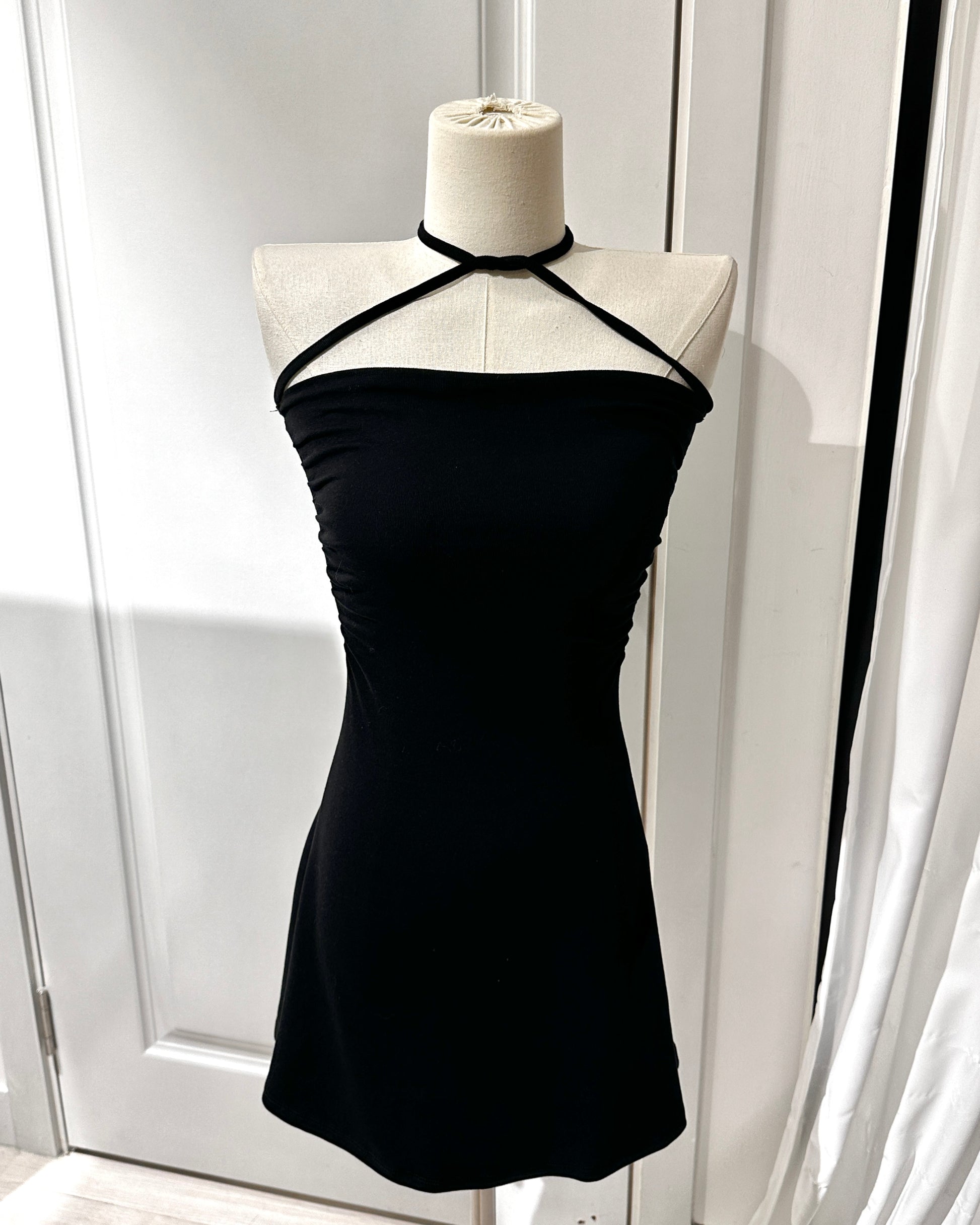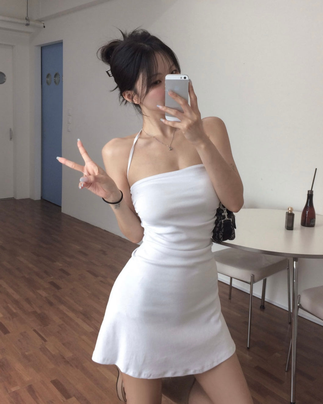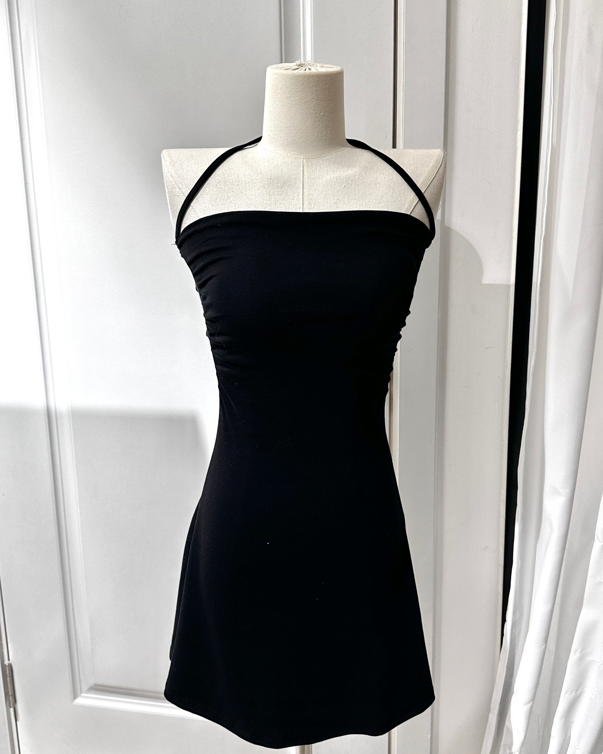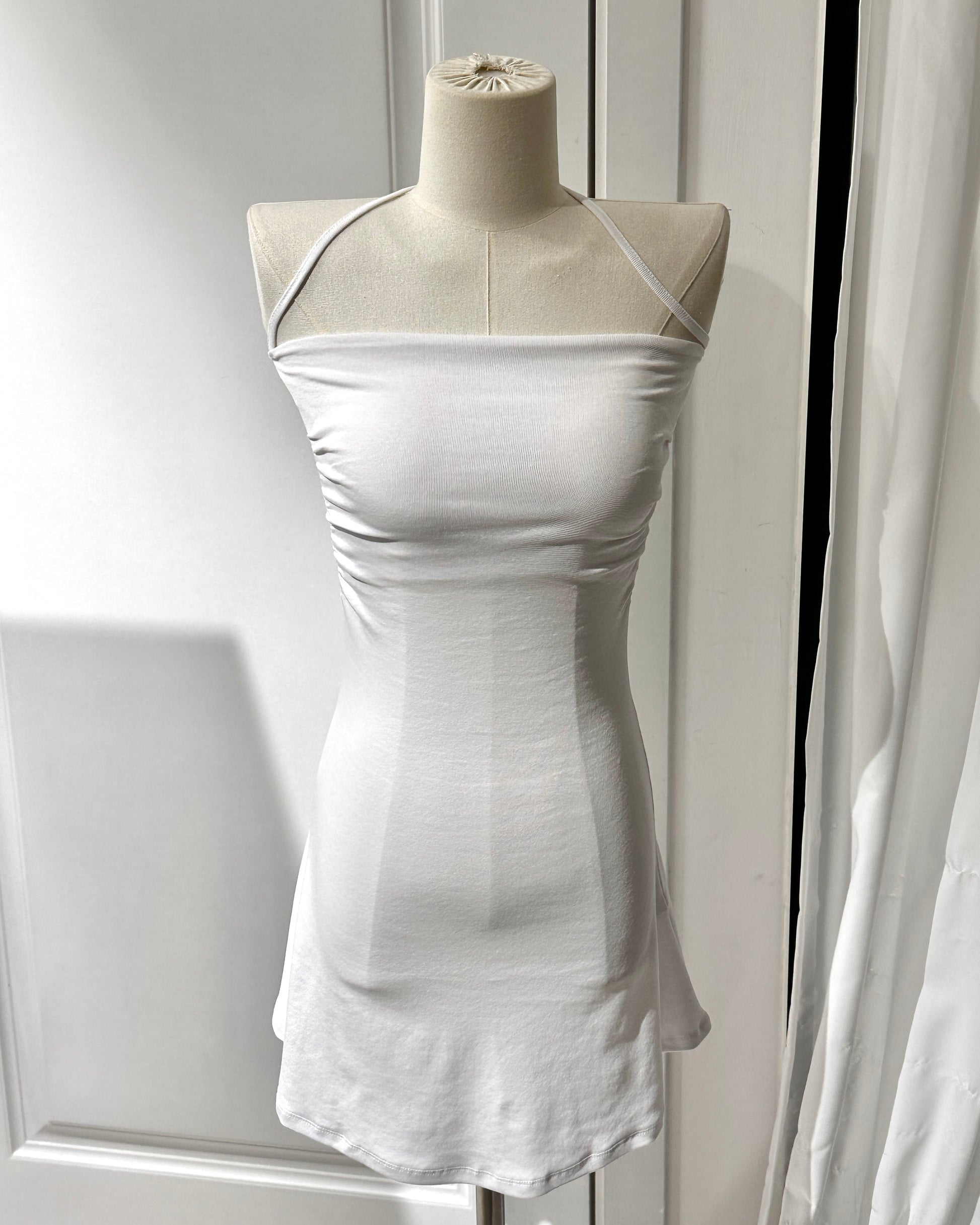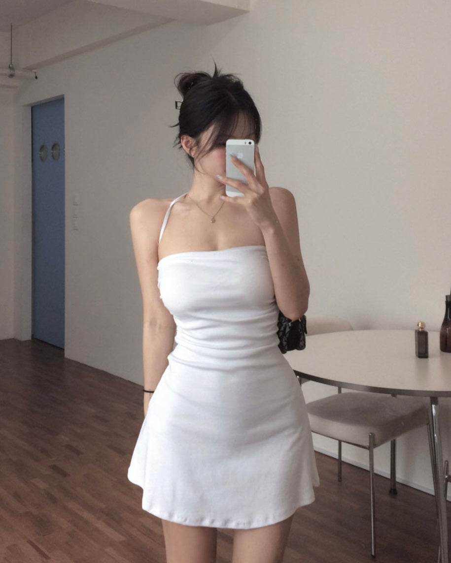 ① 內附胸墊免打底 可移除胸墊 ② 彈力棉質+修腰剪裁 A字傘裙版型 ③ 胸前蝴蝶結/ 掛脖/ 脖前交叉綁頸 3種綁法多變