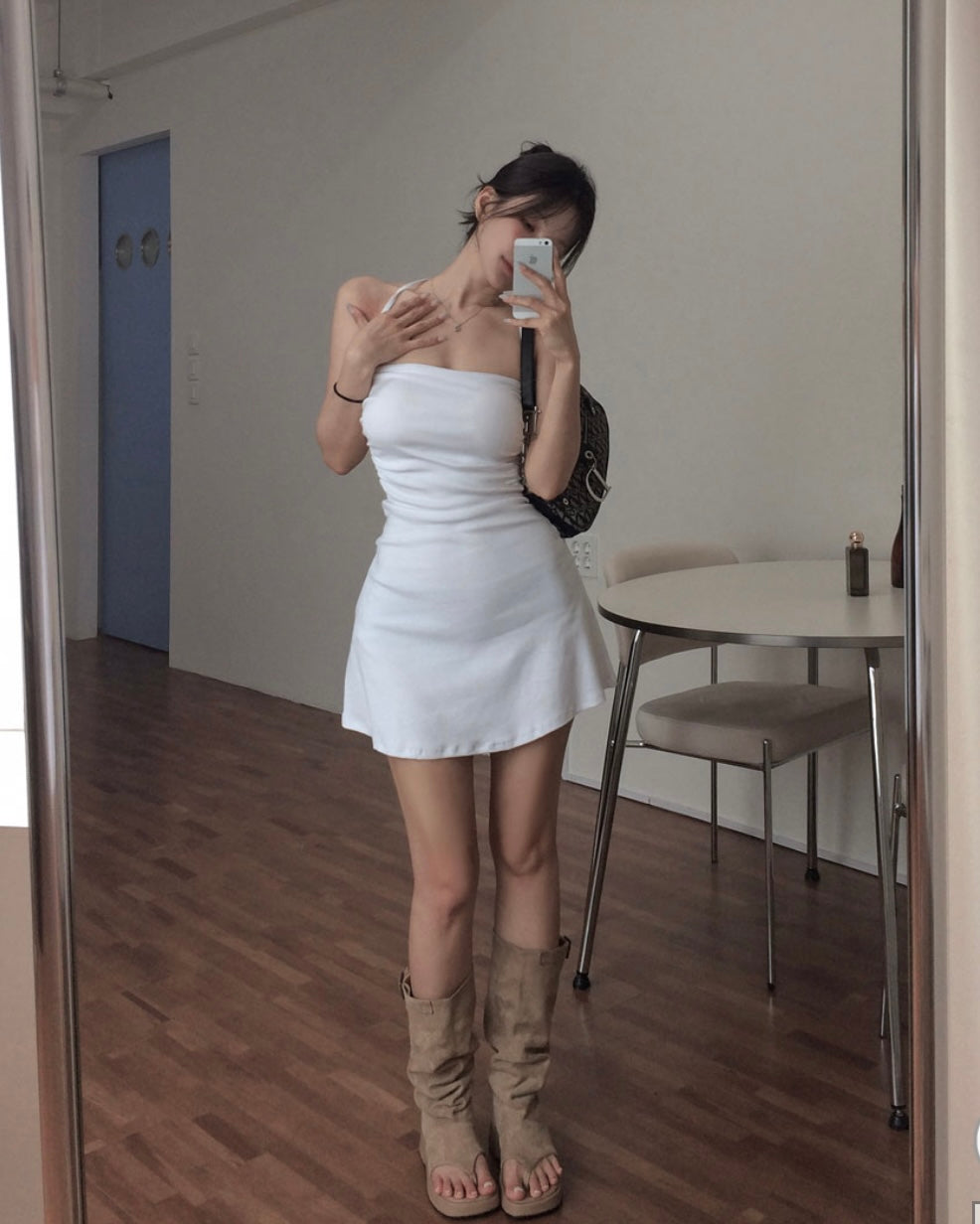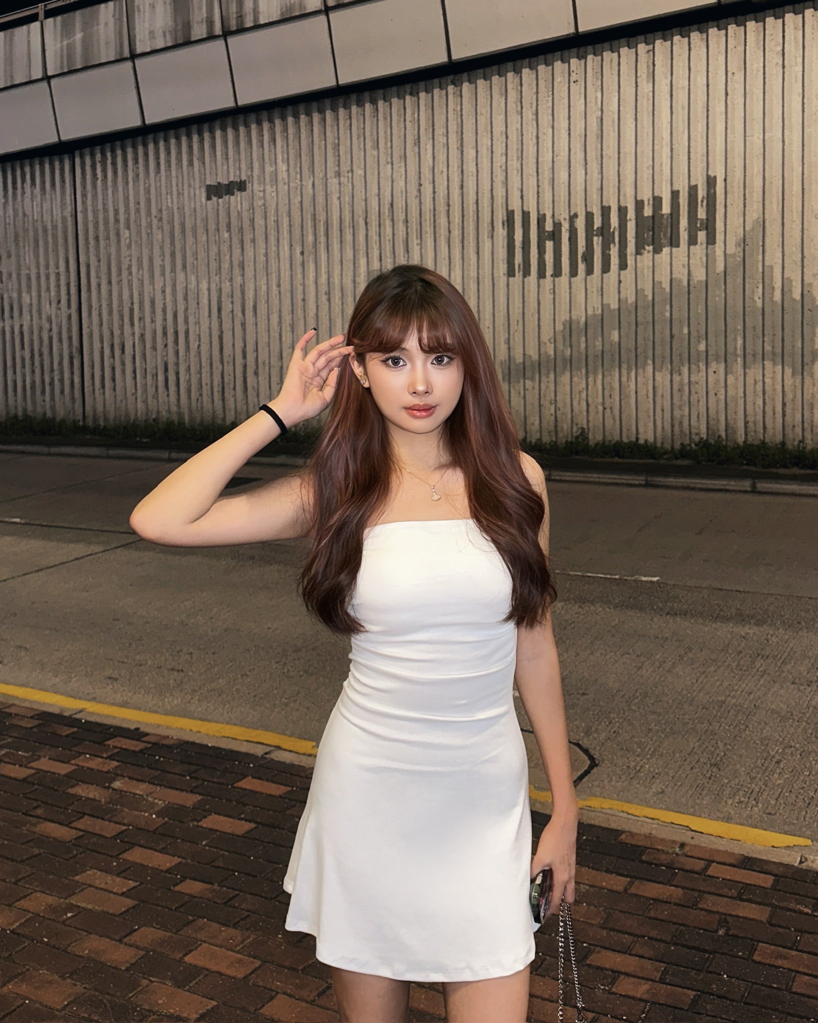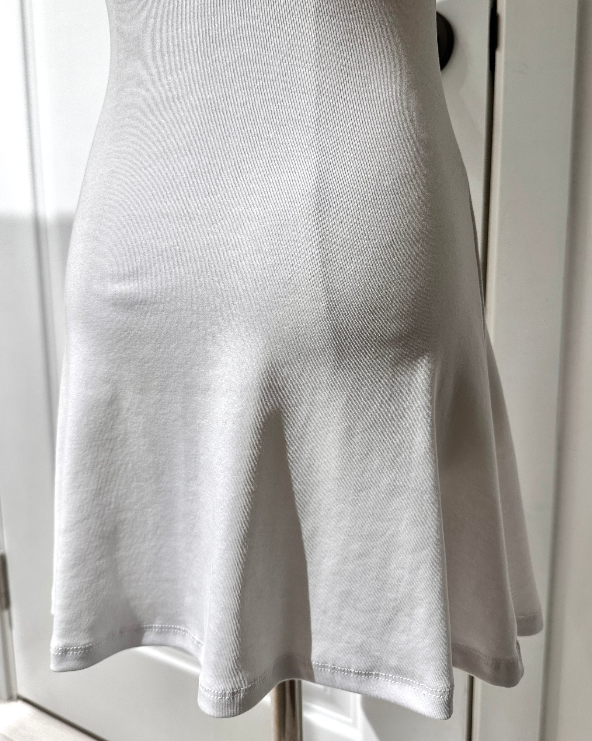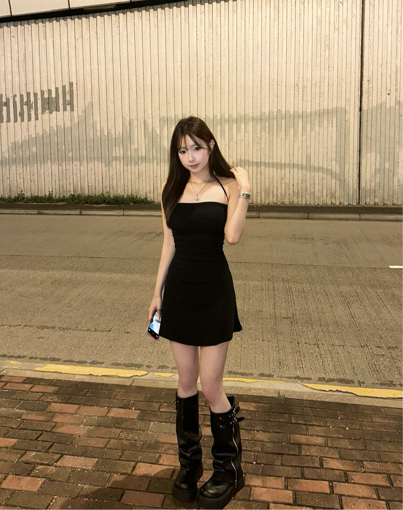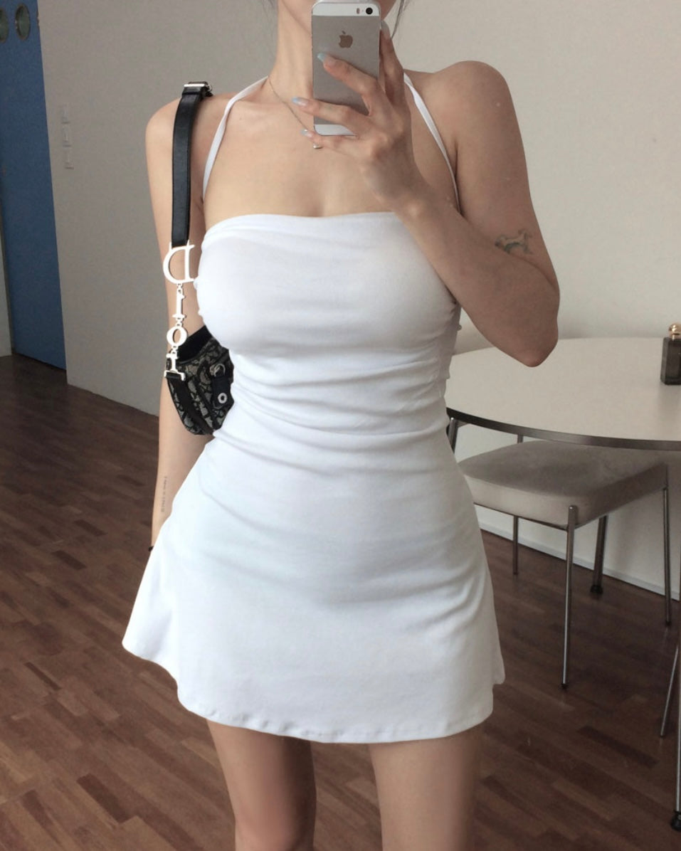 ① 內附胸墊免打底 可移除胸墊 ② 彈力棉質+修腰剪裁 A字傘裙版型 ③ 胸前蝴蝶結/ 掛脖/ 脖前交叉綁頸 3種綁法多變