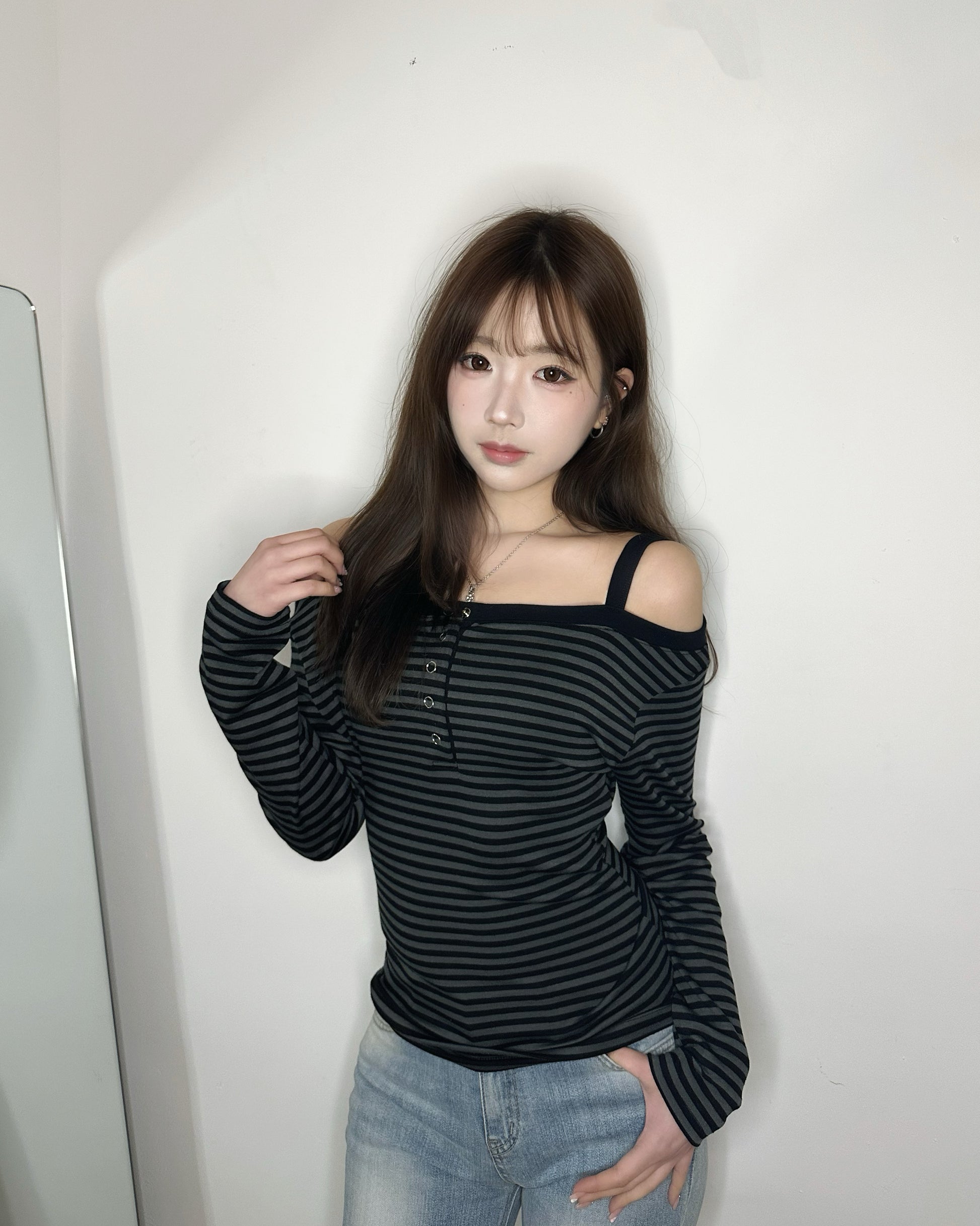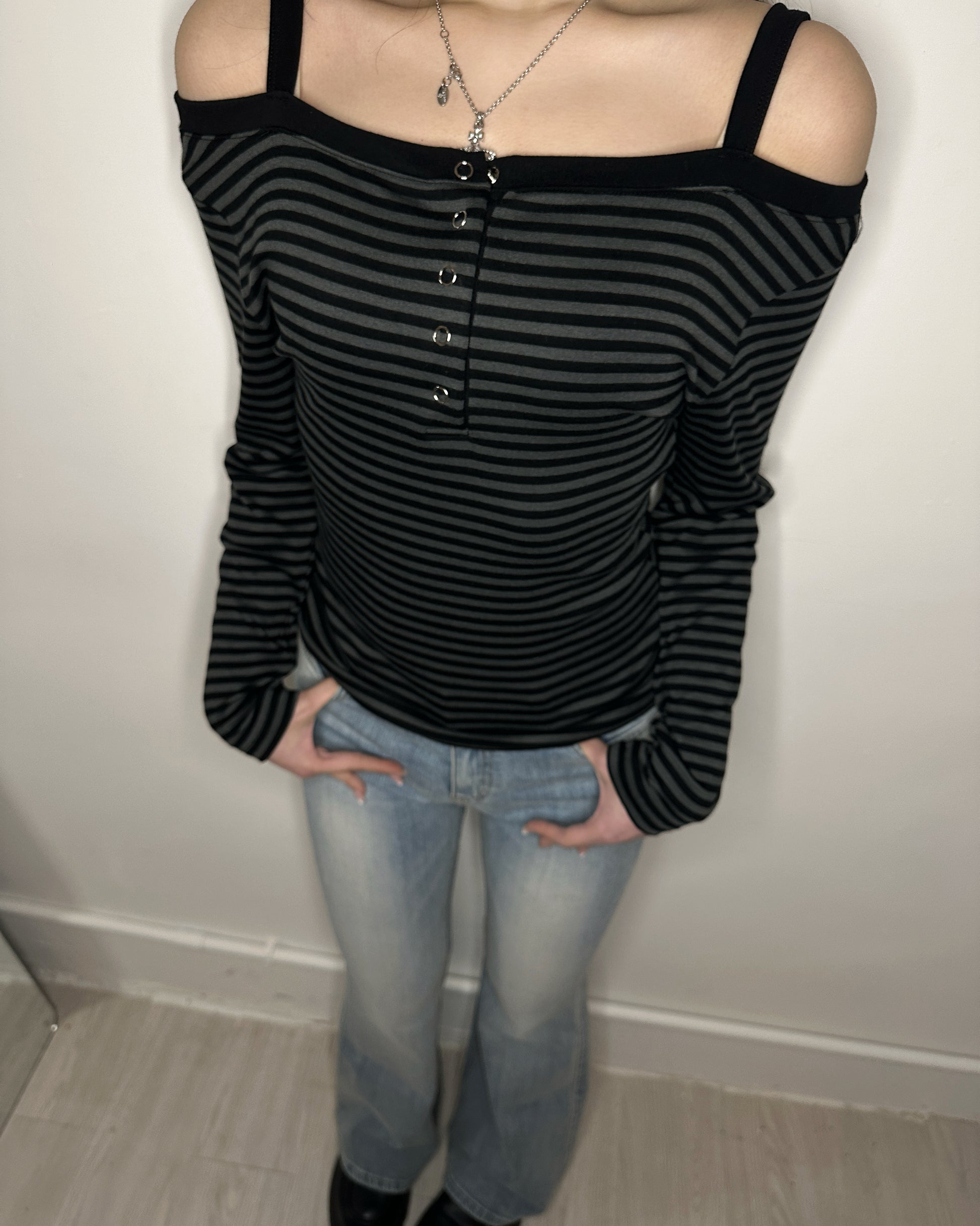 【韓系Monotone♪ 寬鬆百搭款】Mono間條軟身垂墜吊帶排鈕一字肩Top