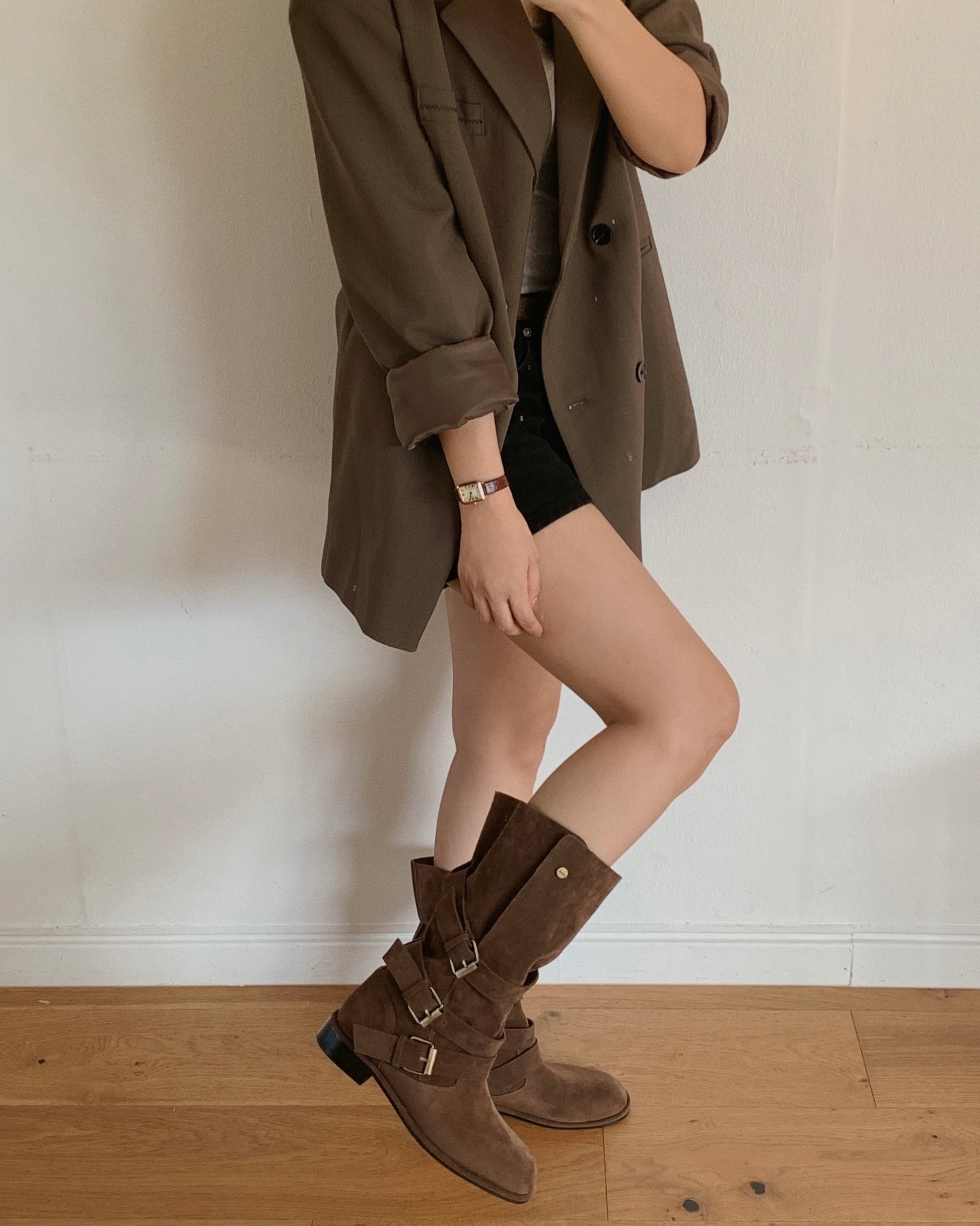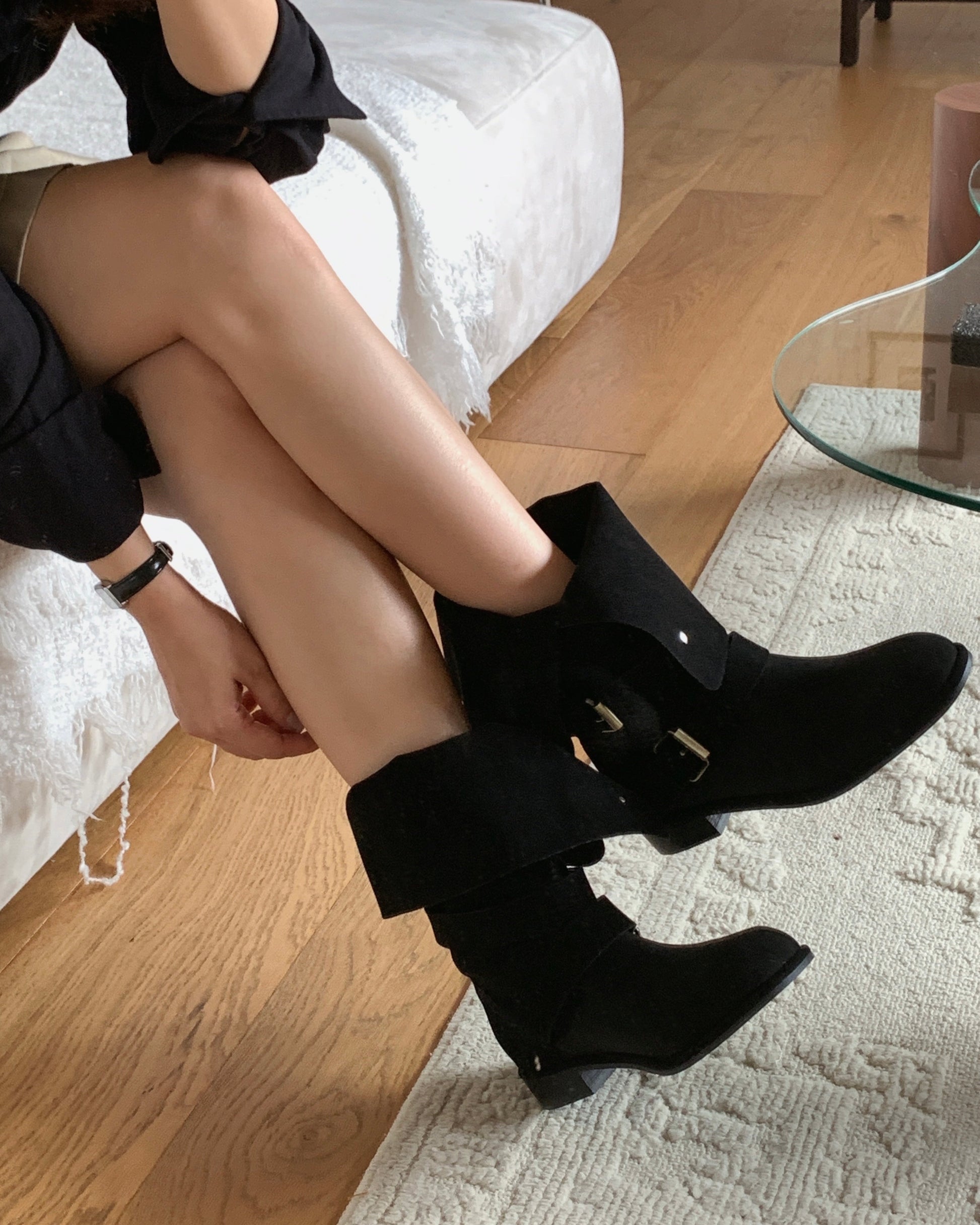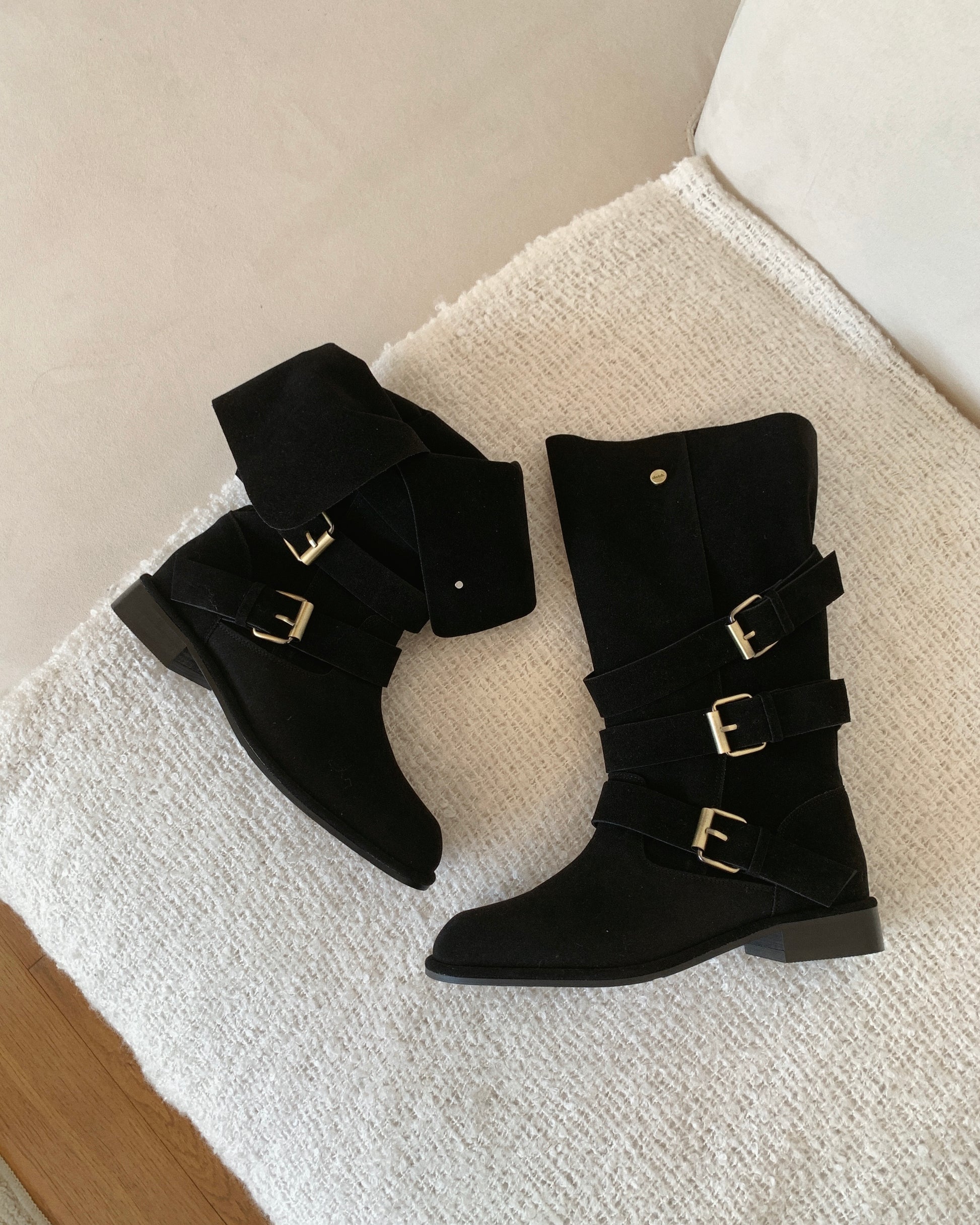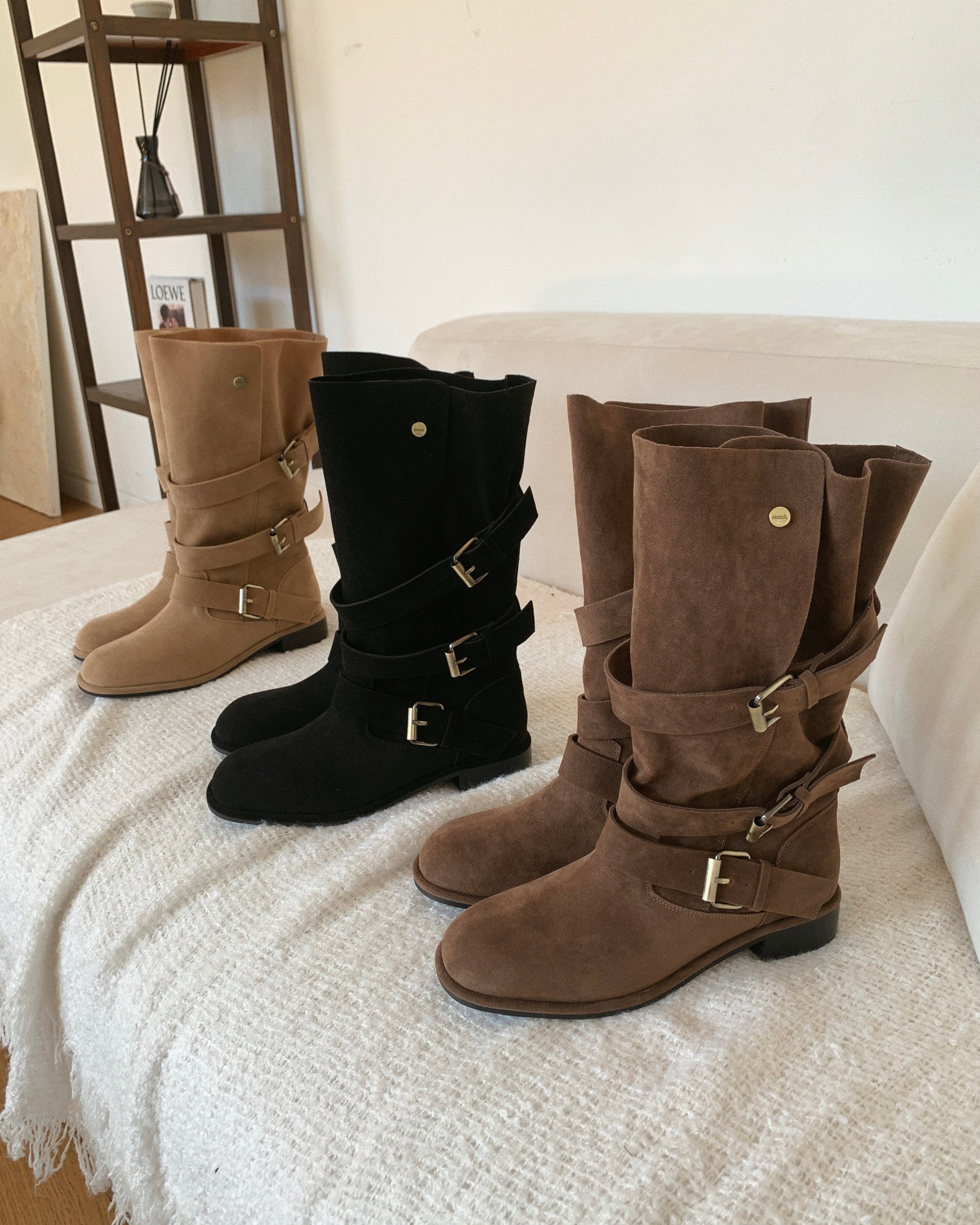 【2 ways可反笠| 零秒提升穿搭感】冬日感復古金扣中筒麂皮長靴