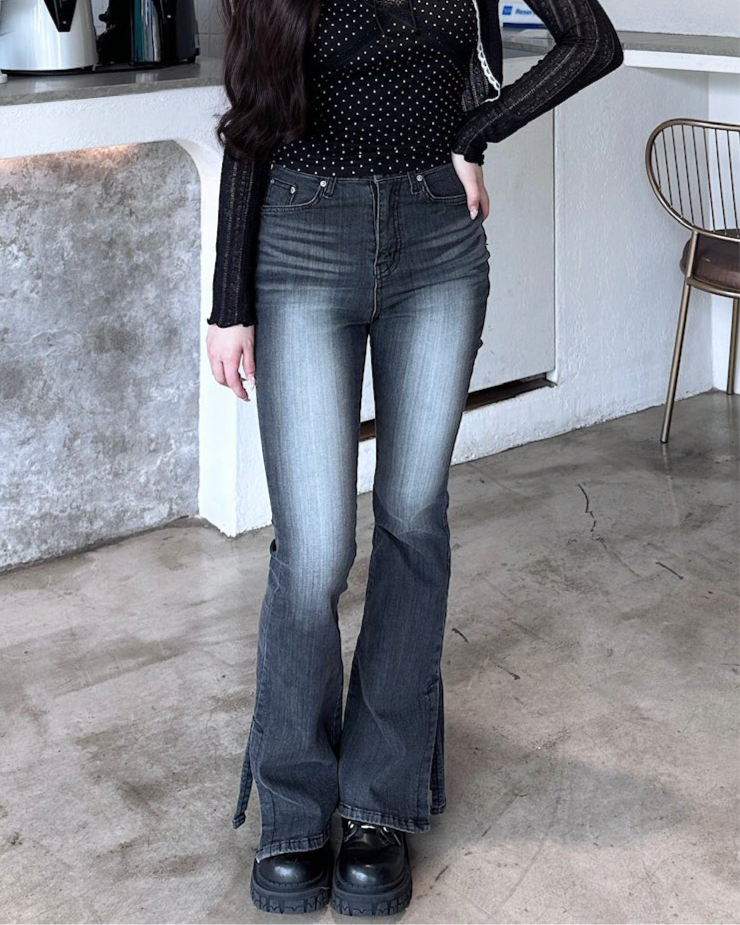 【顯瘦神褲升級ver】Black Mamba 紋理感Stone Washed刷白高腰開叉喇叭褲
