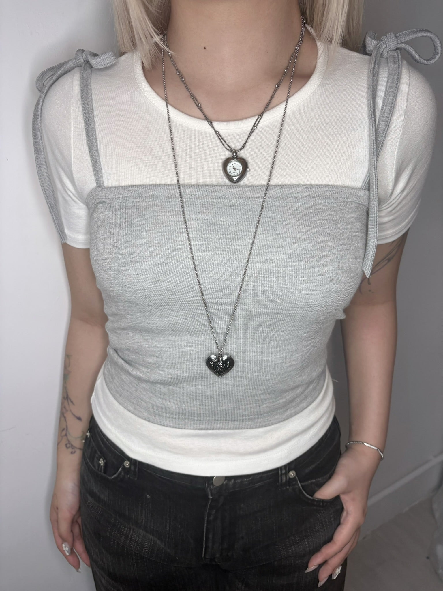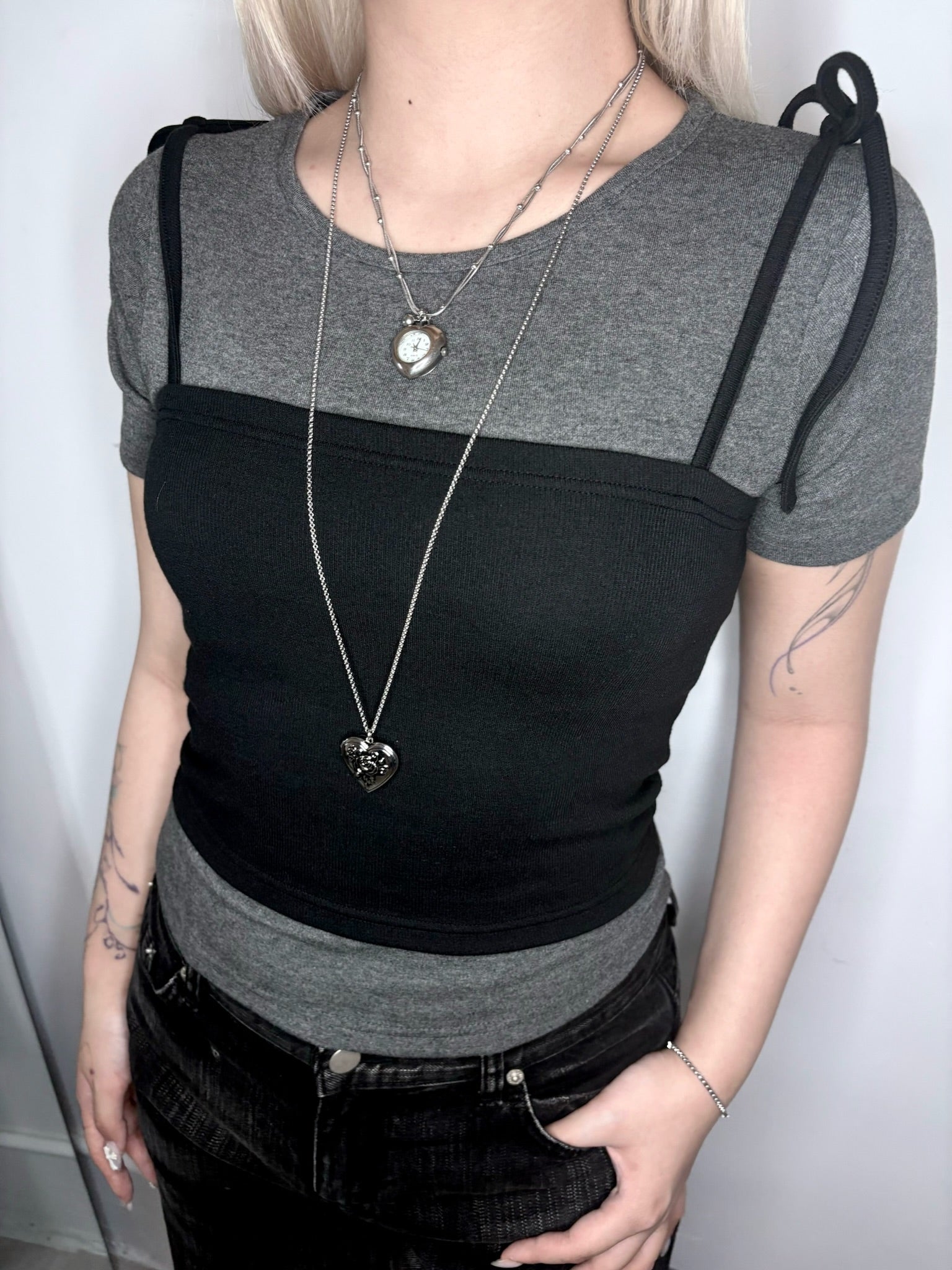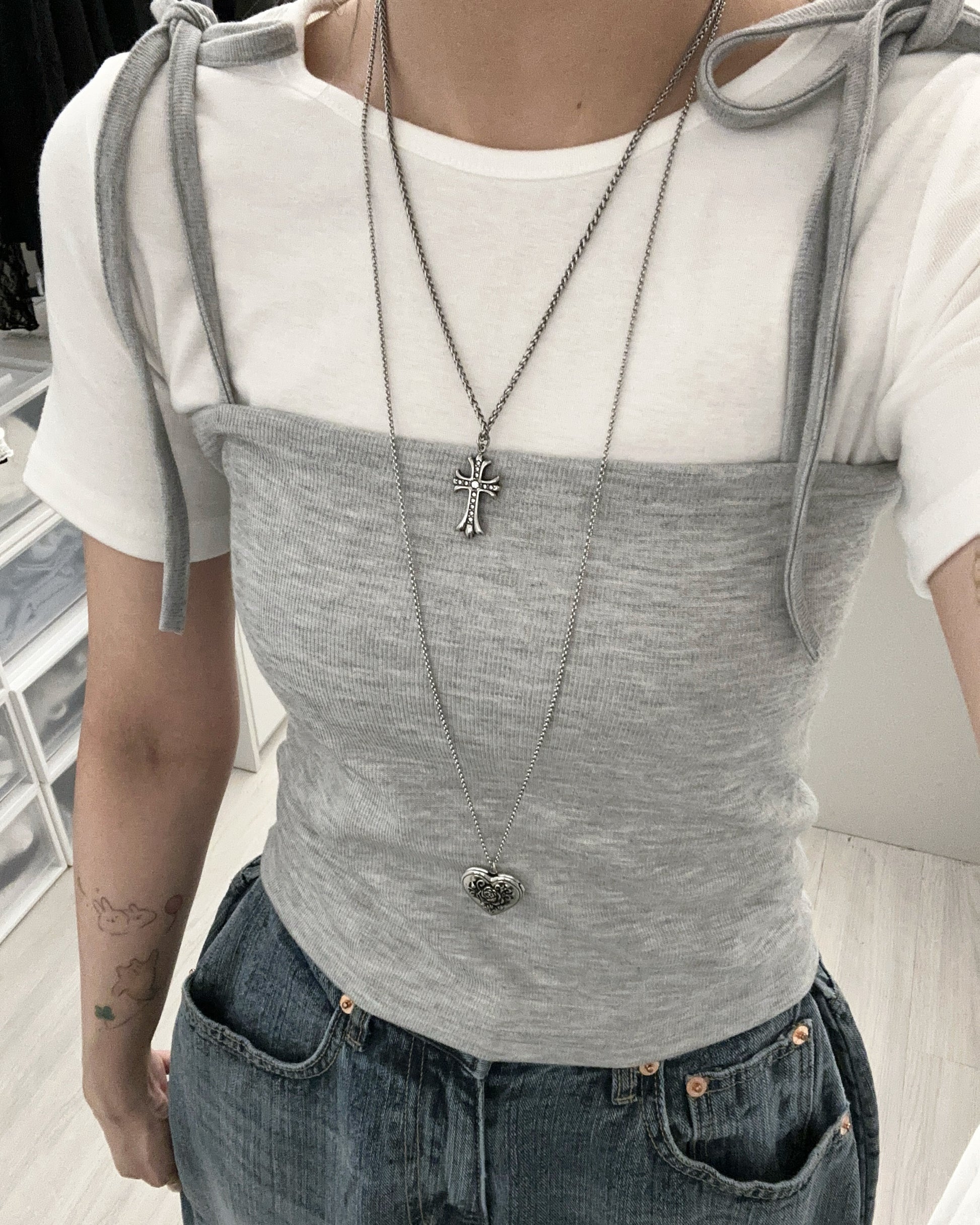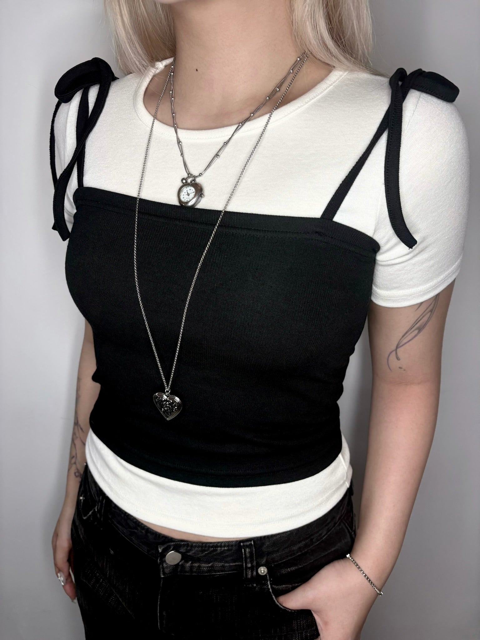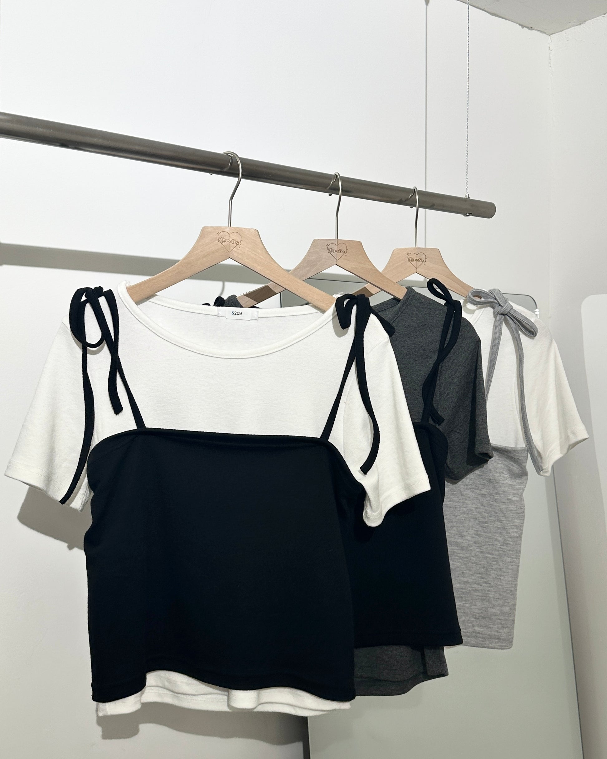 【韓系夏日疊穿CP值套裝| 日常Daily必入】Soft Monochrome 甜美雙肩綁帶蝴蝶結背心 x 寬鬆棉質 T-Shirt 2件套